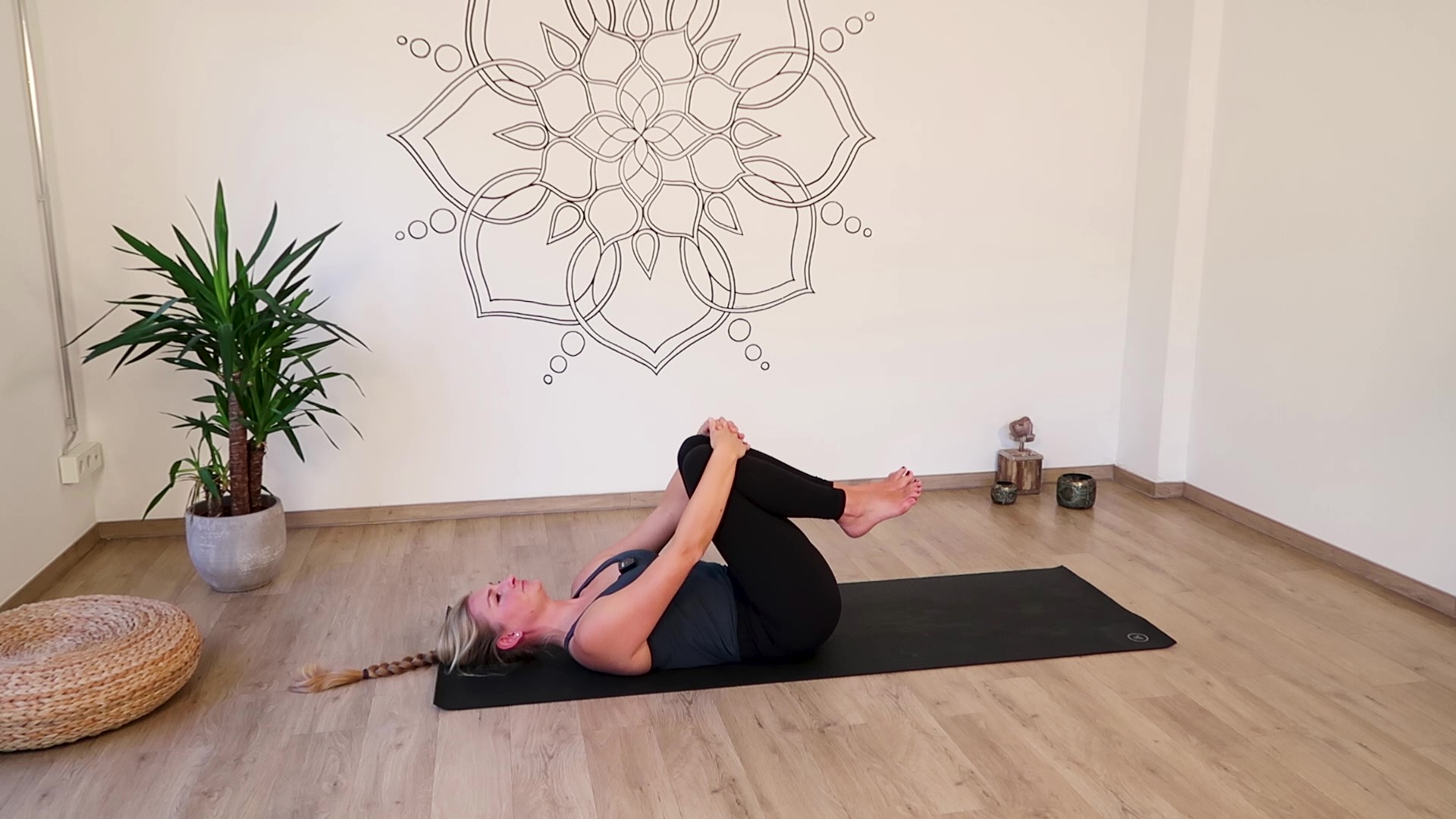 Ausgleichshaltung: Wenn Dir nach einer ausgleichenden Bewegung ist, kannst Du vor dem Seitenwechsel und/oder nach beiden Seiten die Knie zum Oberkörper heranziehen und über den unteren Rücken kreisen. So lässt Du Deinem unteren Rücken eine wohltuende Selbstmassage zukommen.