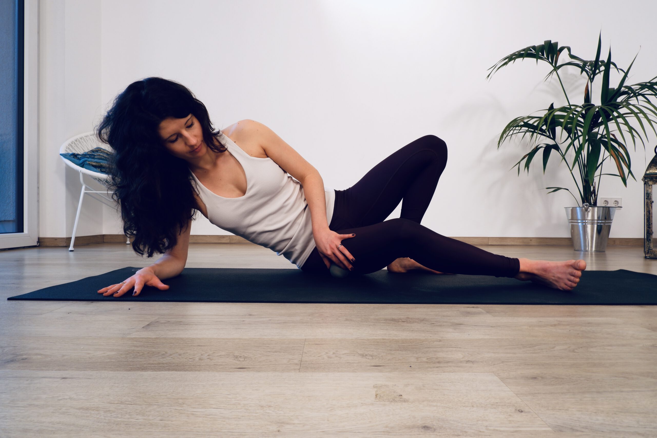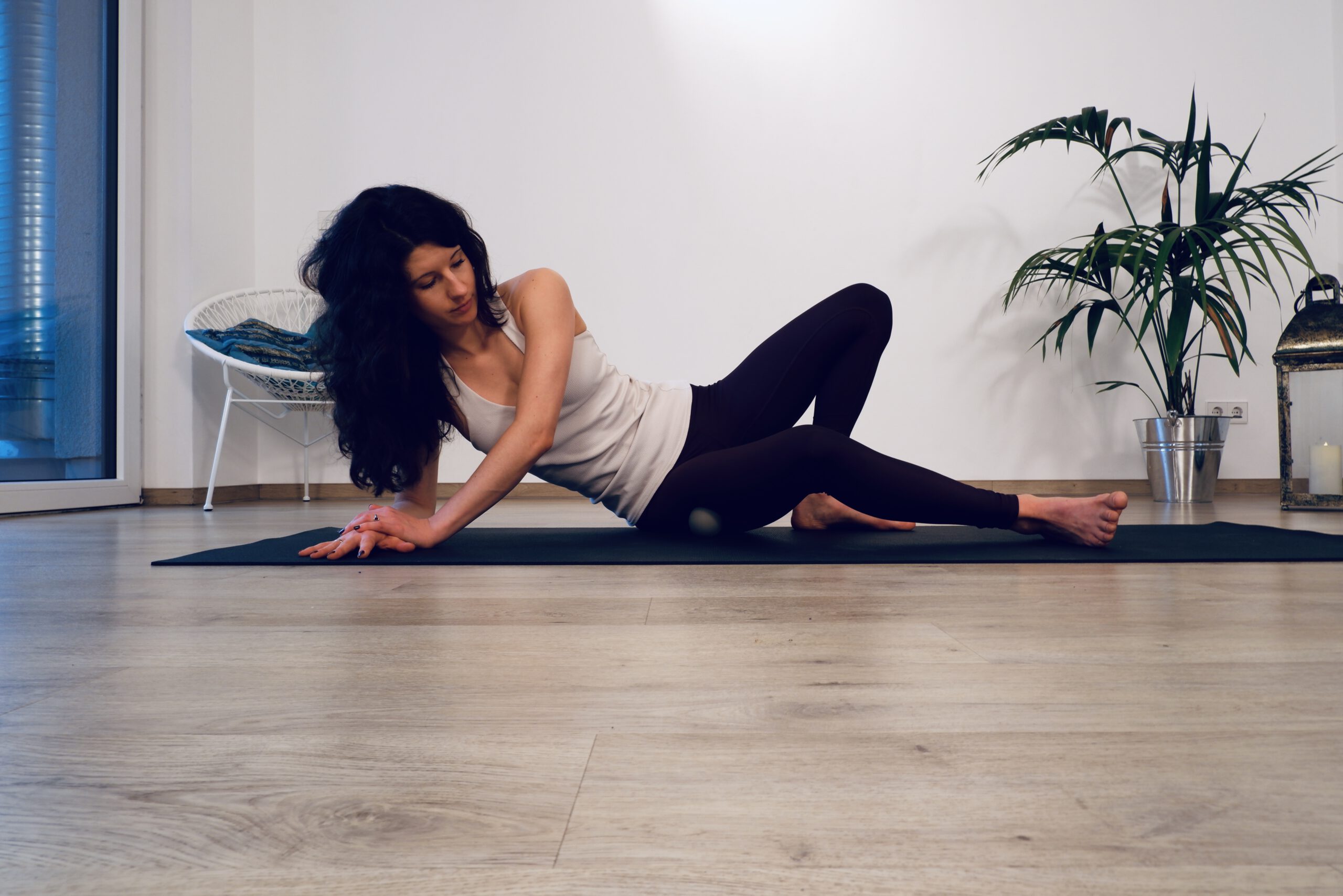 Durch Yogaübungen können wir das IT Band sowohl dehnen, als auch die umgebende Muskulatur stärken um die Hüftstabilität zu gewährleisten. Nachfolgend findest Du drei kräftigende und drei dehnende Übungen sowie eine Triggerpunktmassage als Hausmittel bei Schmerzen an der Außenseite des Beines.